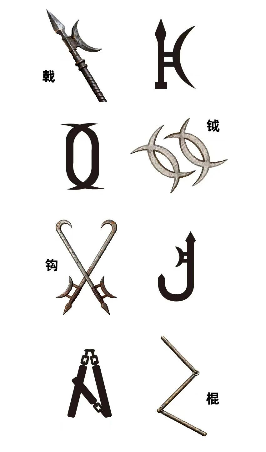 兵器牌有:戟、钺、钩、棍设计演变而成。