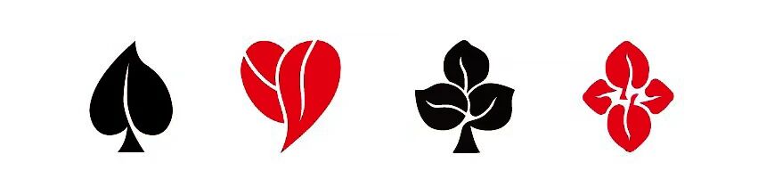 中国纸牌的花色有四种,以叶子为原型,分别由一片叶子、两片叶子、三片叶子、四片叶子,经过设计演变而来。